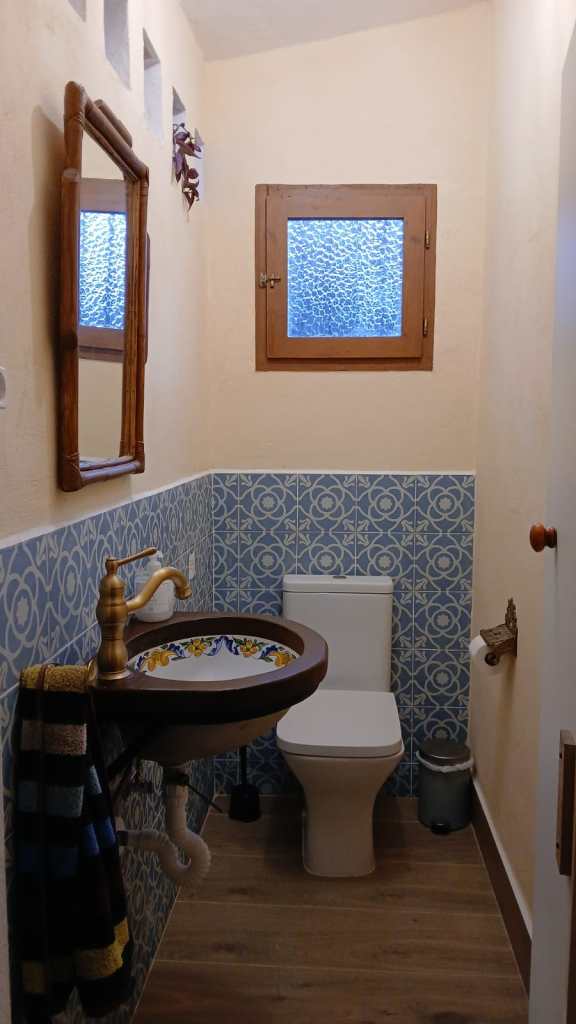 Hay dos baños completos, uno en la primera planta (donde se encuentra un pequeño botiquín) y otro en la segunda, ambos con ducha. También hay un aseo en la planta baja, tras la cocina, junto a la terraza.